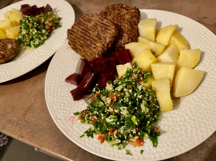 다진소고기 스테이크와 찐감자 그리고 달콤한 비트샐러드와 함께-