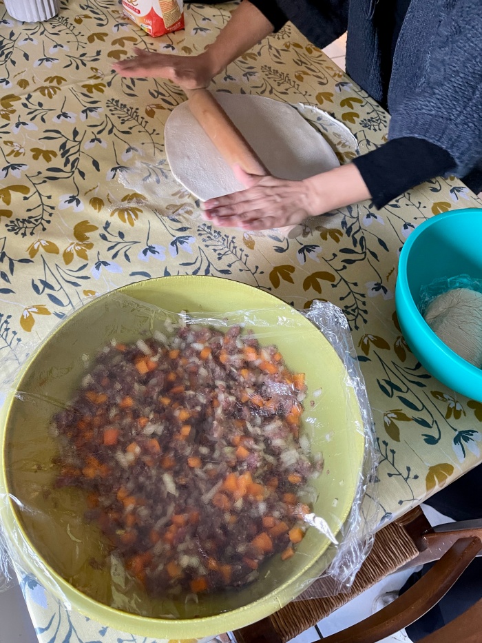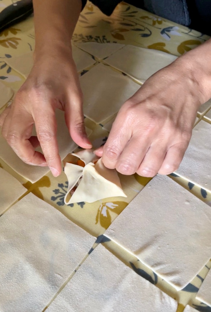 그녀는 곧 만두 비슷한걸 만들기 시작했다. 반죽위에 소를 얹고 보자기처럼 싸서 틈을 메꾼후에 양쪽 날개를 붙였다.
