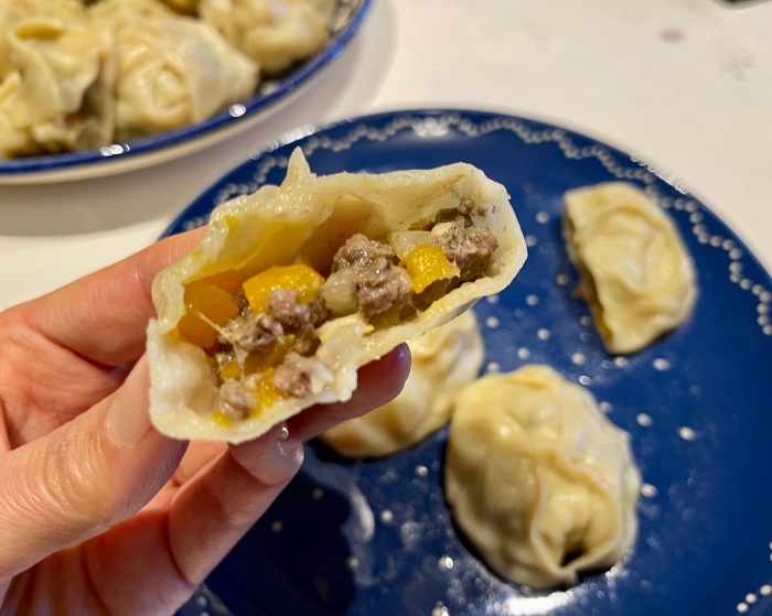 "만두? 와, 이름도 비슷하네? 이건 이름이 만띠(Manty)거든. 돼지고기대신에 소고기를 넣었고 버터넛이랑 양파를 섞었어. 만두도 쪄서 먹는거야?"