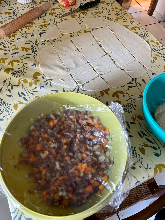반죽을 얇고 넓게 밀고난 그녀는 갑자기 반죽을 바둑무늬로 잘랐다.