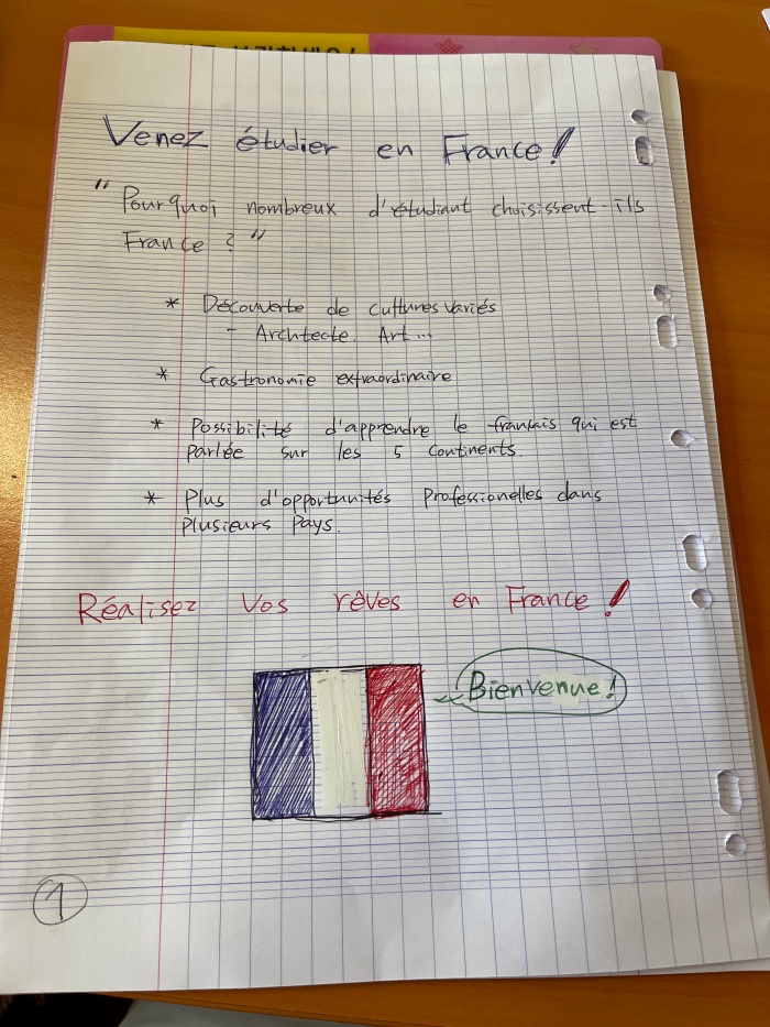 "자 이제는 옆사람과 짝을 지어서, 외국인 학생들에게 프랑스로 유학을 오라는 내용의 전단지를 만들어 봅시다."