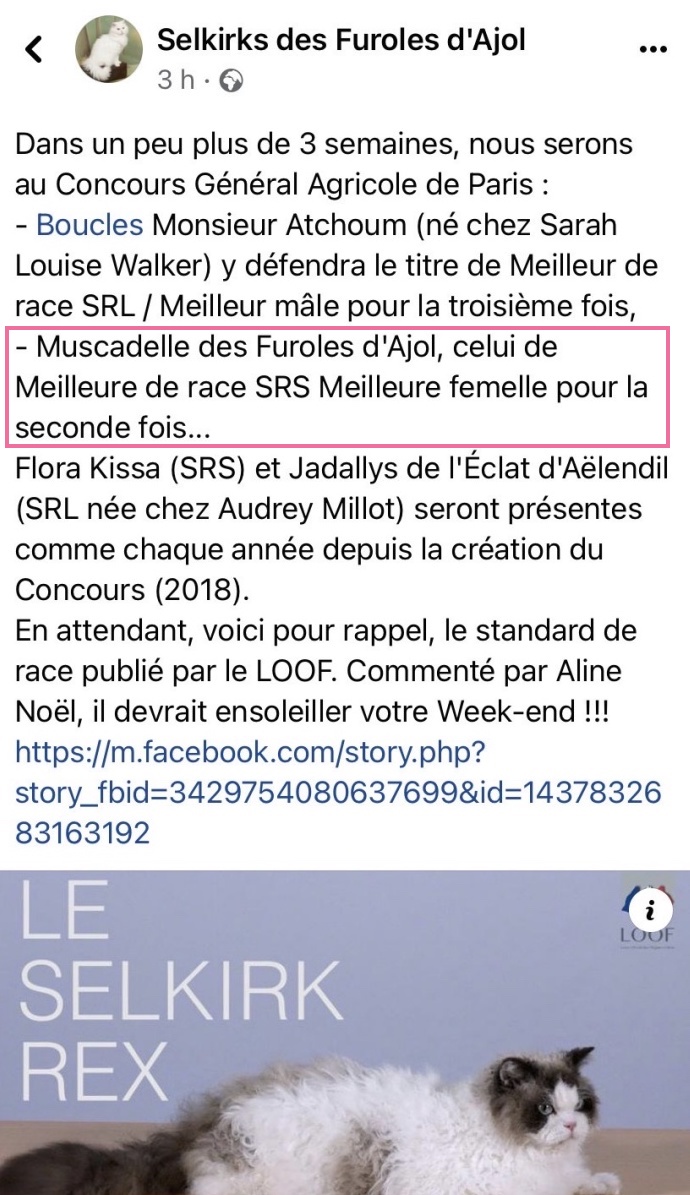 3주후에 Concours Général Agricole de Paris 이 열립니다... 라는 내용으로 시작하는데 거기에 참가하는 셀커크렉스 고양이들을 소개하는 내용이었다. 거기에는 우리 무스카델 이야기도 언급되어 있었다.