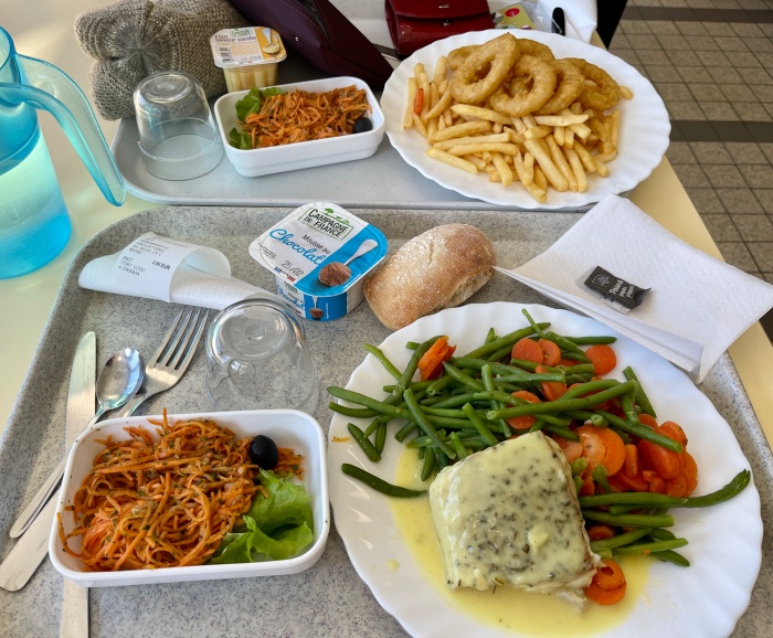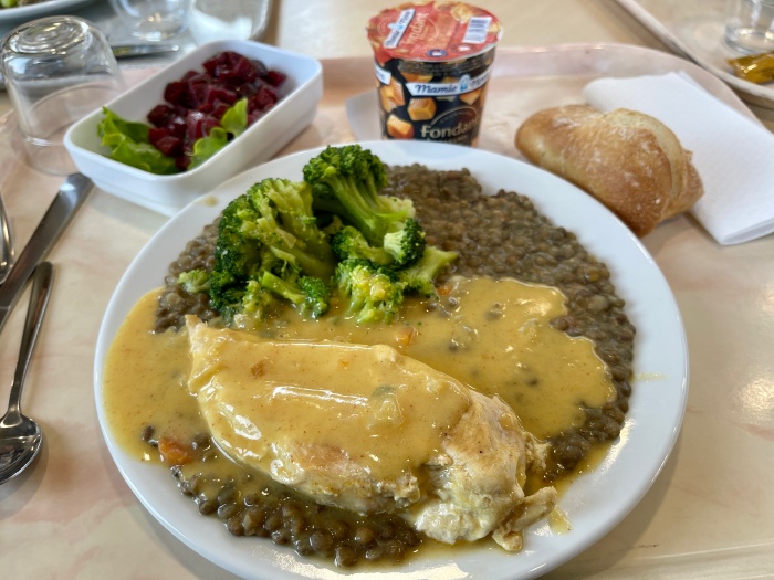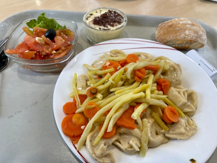 점심 배식은 원래 1시 반까지였는데 우리는 아슬아슬하게 도착했던 관계로 남아있는 샐러드나 디저트 종류가 다양하지 않았다. 그래도 당근라뻬랑 초코무스를 담은 후 메인 메뉴를 받으러 갔는데, 생선이 딱 한조각이 남아있는게 보였다.
