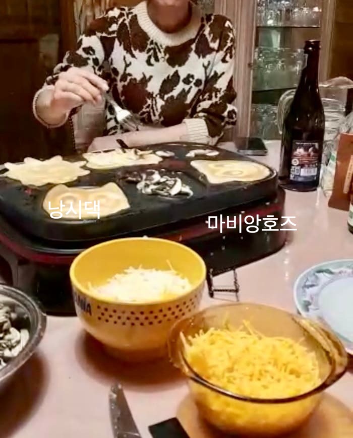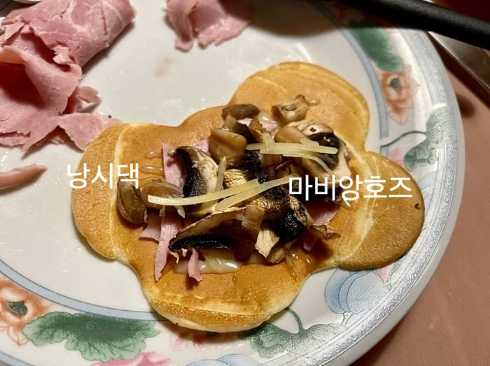 반죽이 어느정도 익으면 치즈를 올려서 녹이고 그 위에 버섯과 정봉을 얹어서 말아 먹었다.