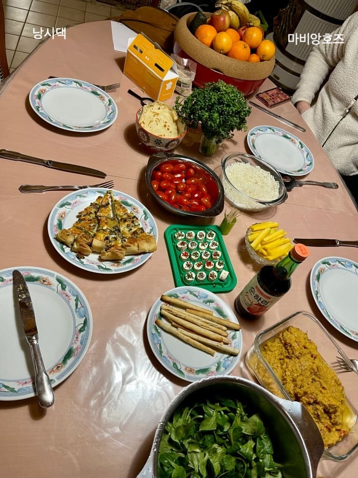 쏨이 사온 치즈와 내가 사온 방울토마토도 상에 올랐다. 나는 냉장고에 있던 노란색 당근도 깍아서 길쭉하게 썰어서 냈다. 내가 가져온 키슈도 아직 두조각이 남아있고 렌틸카레도 넉넉하다.