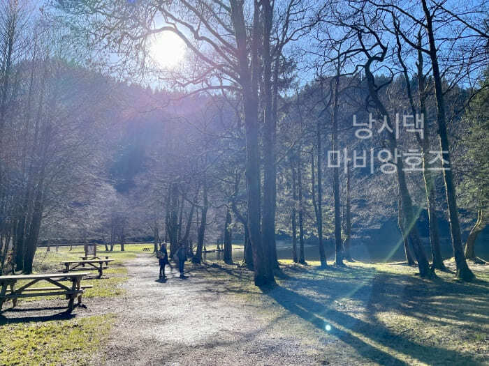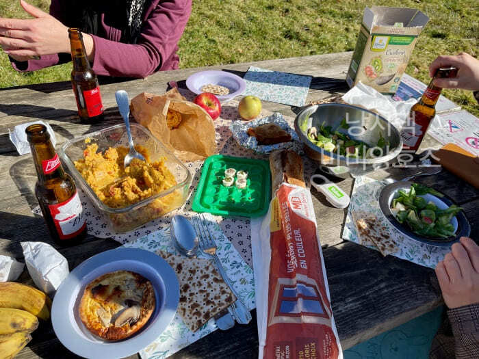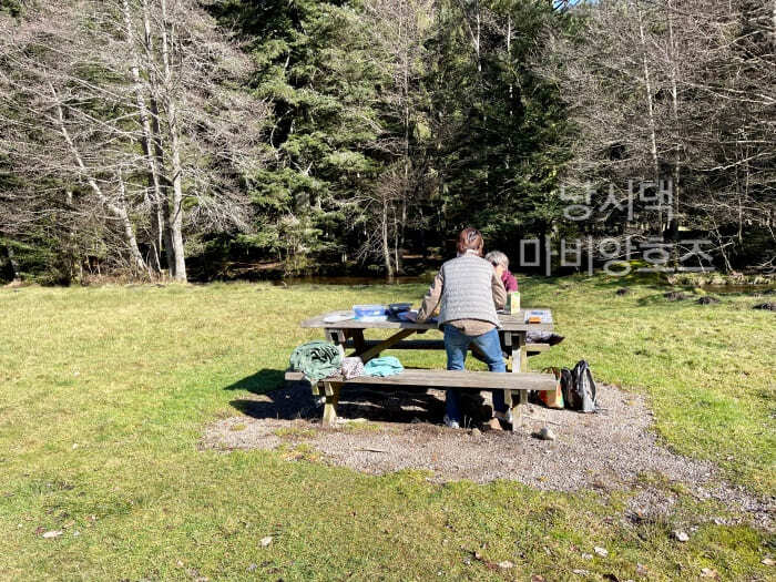 내가 호수 풍경에 심취해 있느라 뒤쳐져 있을때 친구들은 개울가에 있는 테이블에 자리를 잡고 피크닉을 준비하고 있었다.