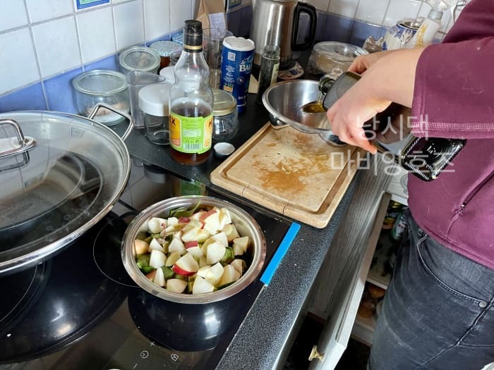 카린은 우선 남은 샐러드에 아보카도와 사과를 넣고 맛있는 샐러드를 뚝딱 만들었다.