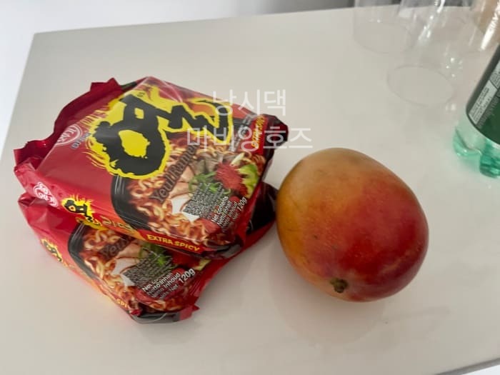 항상 아낌없이 베푸는 친구에게 미안하고 고마운 마음에 집에서 미리 챙겨온 라면2개랑 망고를 테이블에 꺼냈다. (4명이 될거라고는 예상하지 못했음)