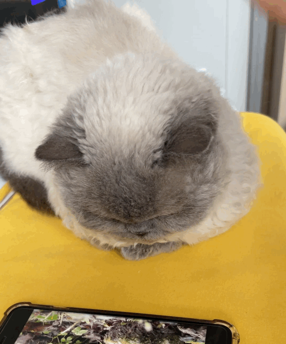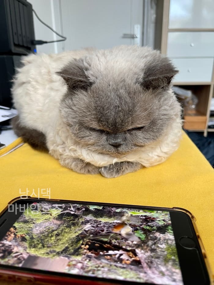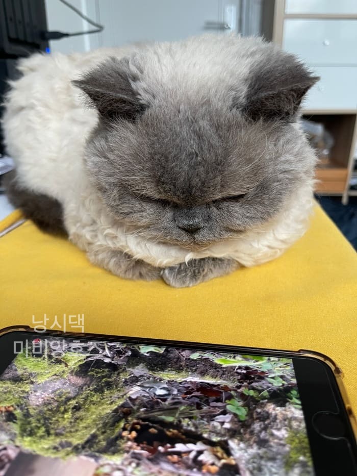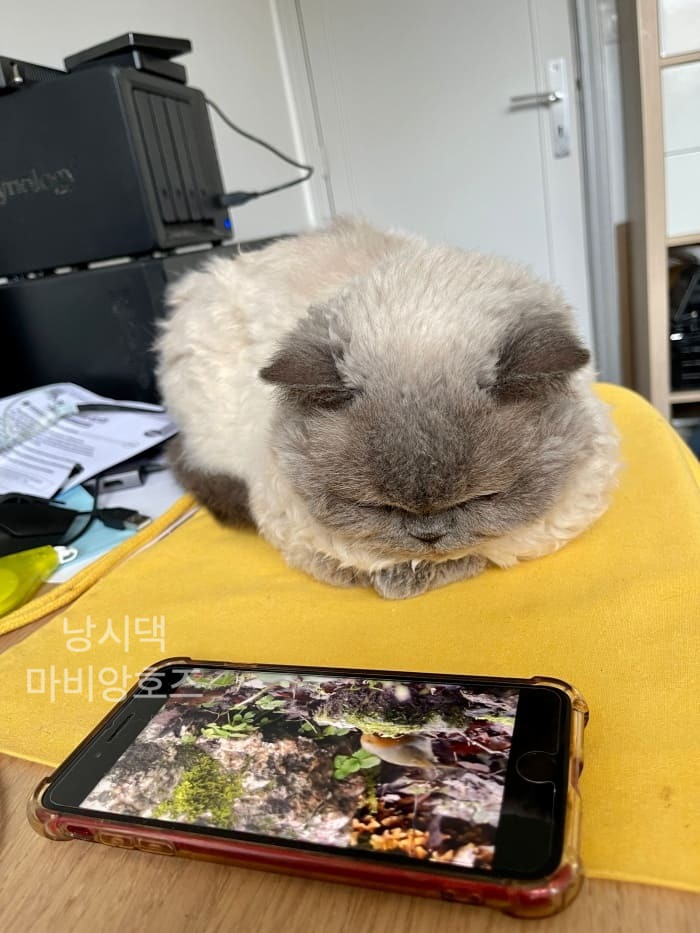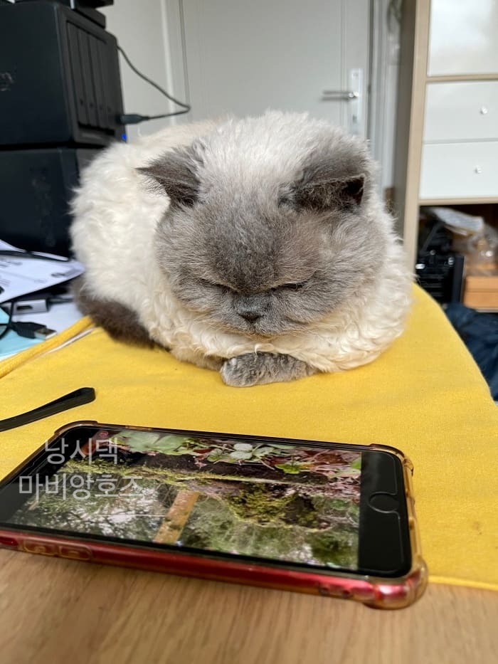 매정하게 대할 수가 없어서 안쓰는 휴대폰으로 오랜만에 동영상을 틀어줬다. 그리고 노란색 천가방 위를 두드리고 이리로 오라고 했더니 고분고분 자리를 잡고 앉는 무스카델.