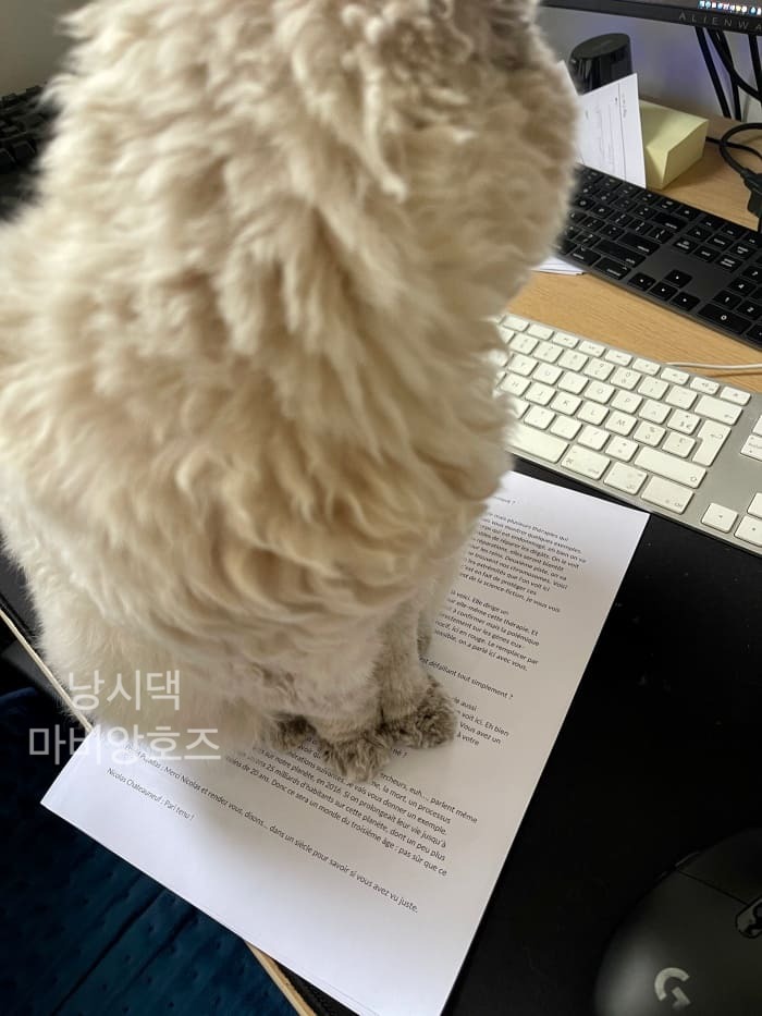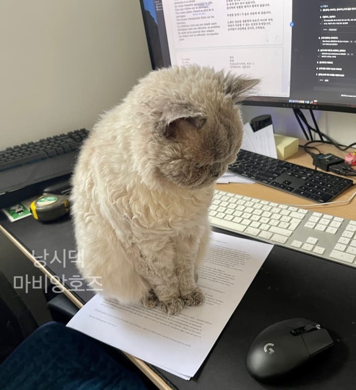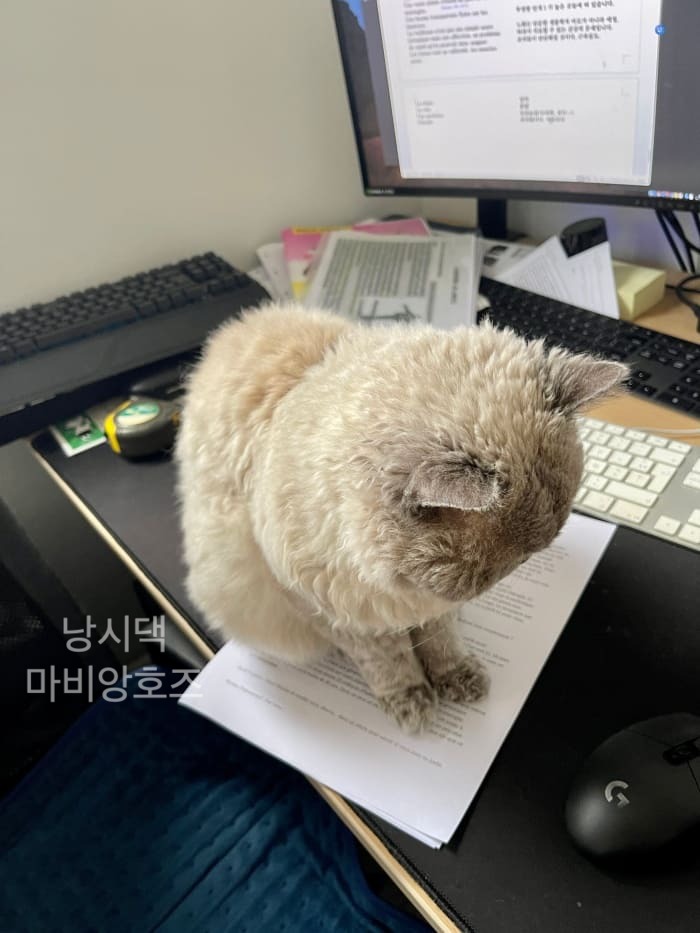 아침일찍 책상앞에 앉았더니 옆에 바짝붙어서 같이 앉아있는 무스카델.