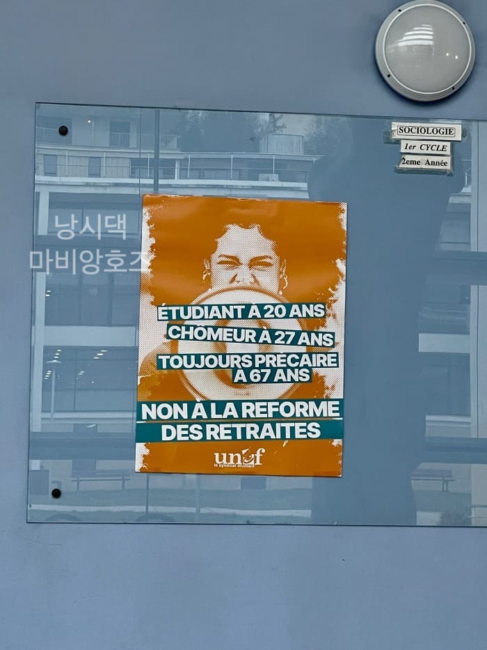 "연금개혁도 단순하게 62세에서 64세로 2년을 연장하는게 아닌거 알지요? 이제 연금을 모두 받으려면 43년동안 쭈욱 쉬지 않고 근무를 해야 해요. 프랑스에서는 대학원이 필수나 마찬가지라서 학생들이 최소 5년을 공부하고 나서 해외 경험도 쌓고 하다보면 늦게 사회 생활을 시작하게 된단말이지요. 만일 27살에 직장생활을 시작한다면 쉬지않고 쭈욱 일할 경우 70세가 되어야 연금을 모두 받게돼요. 그런데 중간에 실업기간이 생길수도 있고, 여성들의 경우에는 육아 휴직이나 파트타임 근무가 흔해서 43년을 채우기가 어려운 사람들이 많아요."