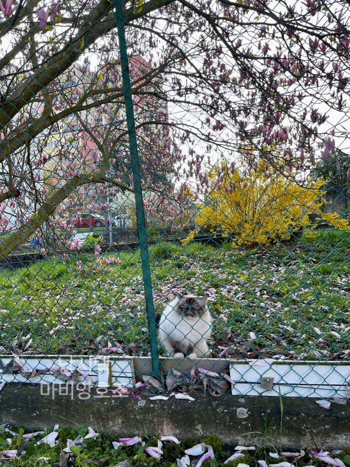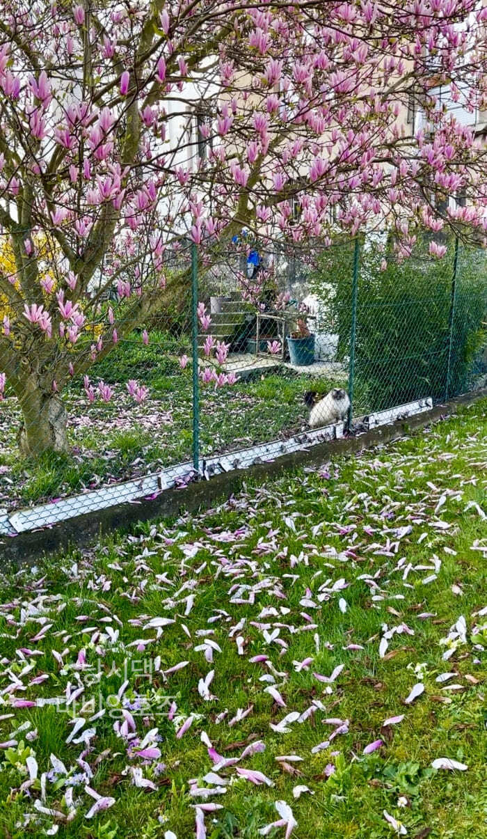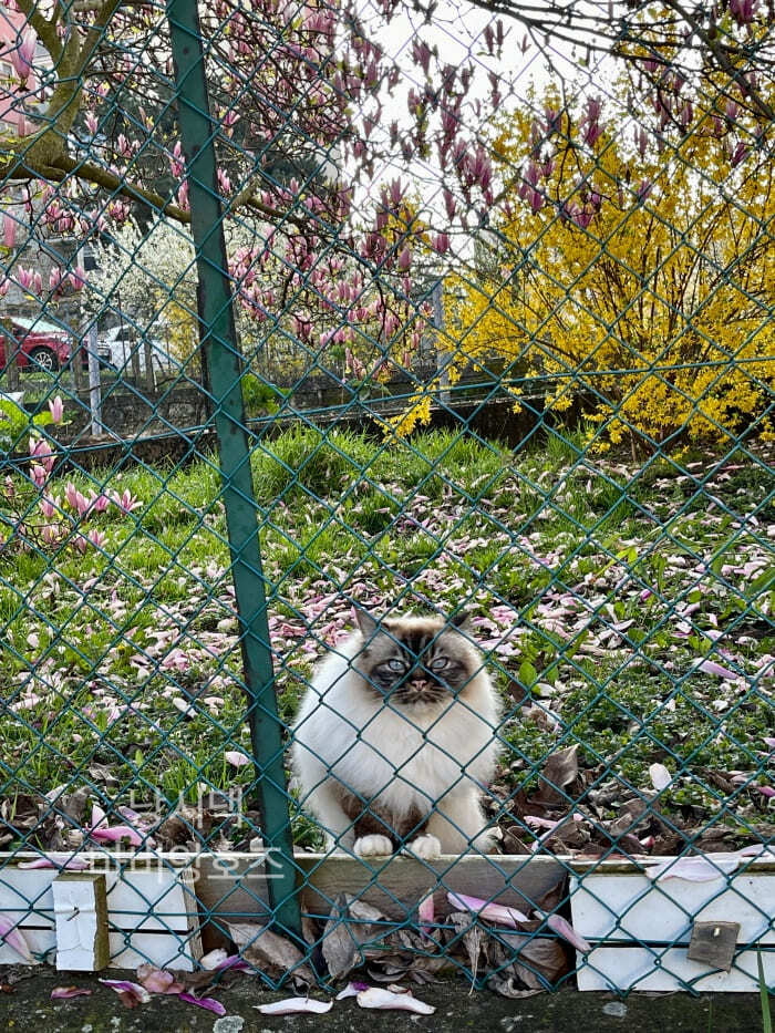 아침일찍 리들에 가서 일주일 장을 봐서 돌아왔는데, 트렁크에서 짐을 꺼내는 중 꽃나무 아래에서 옆집 고양이가 나를 쳐다보고 있는게 보였다. 그럼 가서 인사해줘야지.