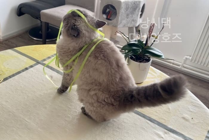 무스카델이 좋아하는 보라색 리본이 사라지고 난 후 (내 친구가 놀러왔다가 식탁위에 있길래 버렸다고 한다...ㅋㅋ 그리고나서 엄청 사과했음ㅋㅋㅋ) 무스카델은 낡은 노란색 리본을 다시 갖고 놀고 있었다.