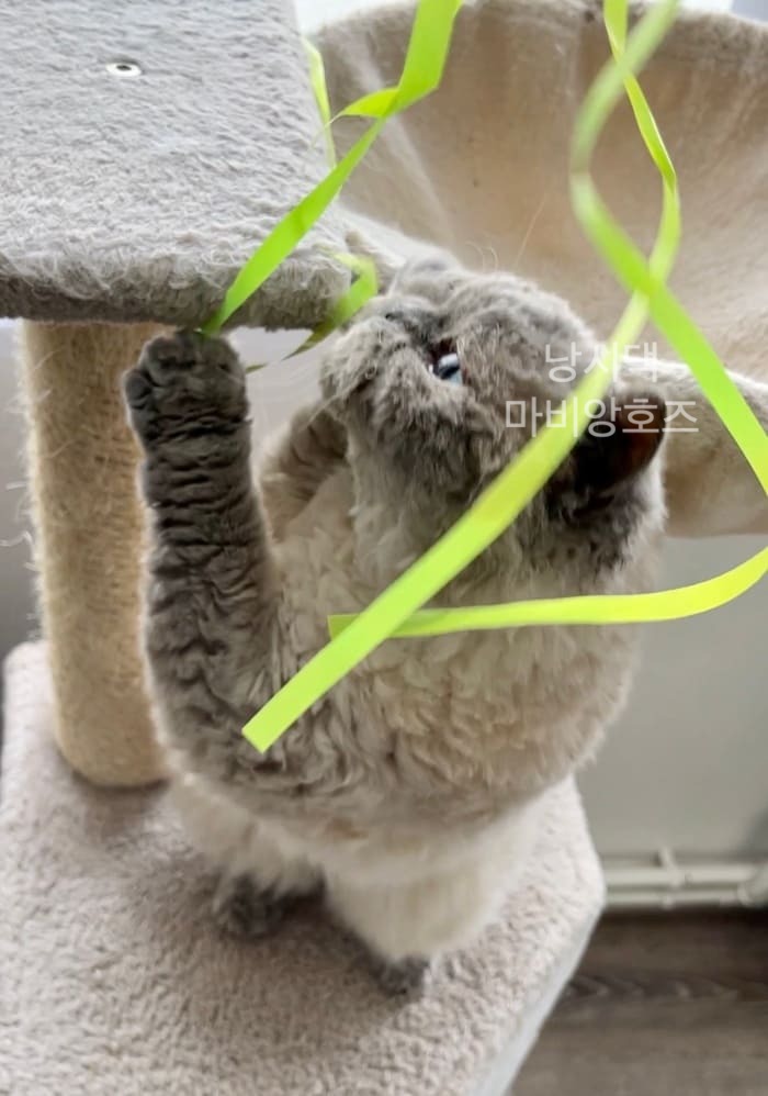 나머지 긴끈은 캣타워에 묶어놨더니 혼자서 주먹질 하면서 잘 논다.