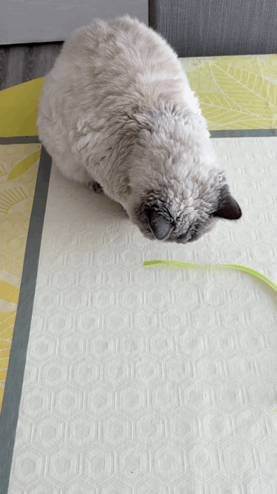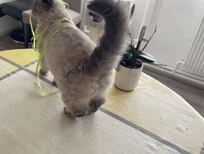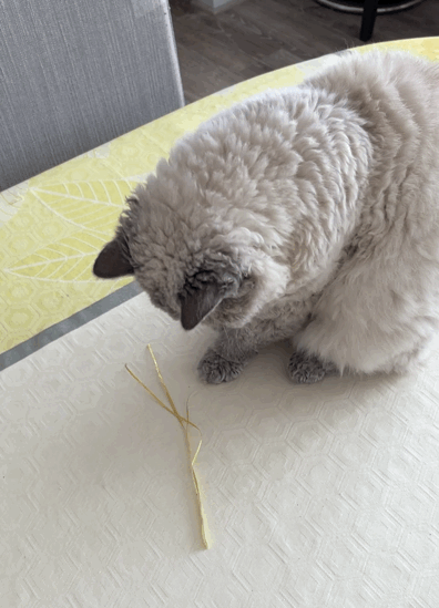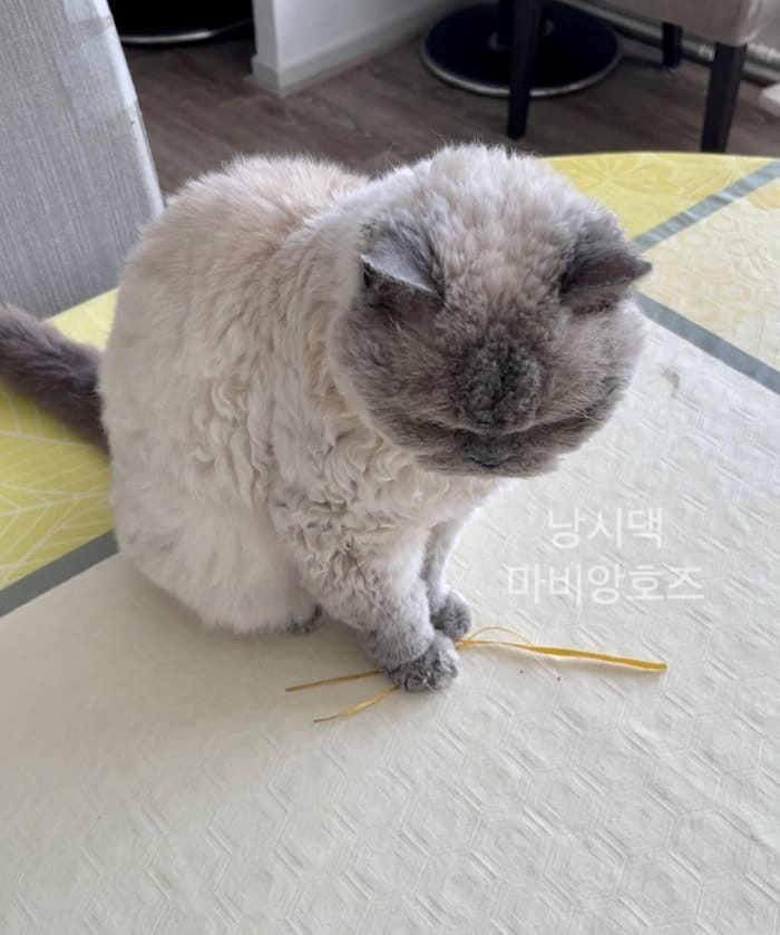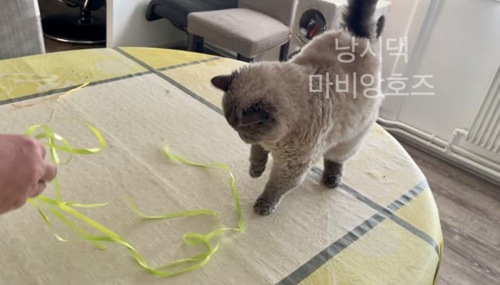무스카델이 좋아하는 보라색 리본이 사라지고 난 후 (내 친구가 놀러왔다가 식탁위에 있길래 버렸다고 한다...ㅋㅋ 그리고나서 엄청 사과했음ㅋㅋㅋ) 무스카델은 낡은 노란색 리본을 다시 갖고 놀고 있었다.