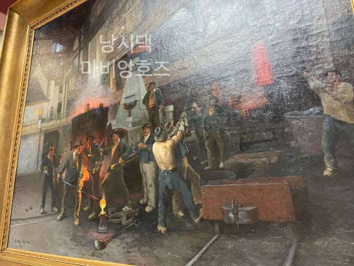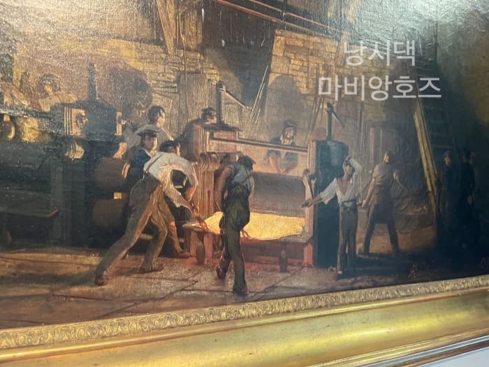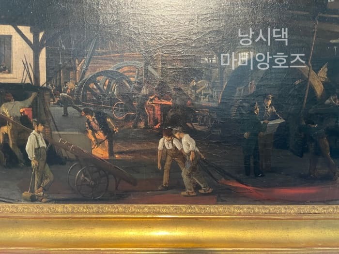 "이 유화를 잘 봐 주세요. 1800년대 Ignace-François Bonhommé라는 화가가 주물공장에 직접 가서 현장을 사진처럼 생생하게 묘사한 작품이예요. 이 화가는 이런 그림을 주로 그렸어요. 일반서민들이 일하는 모습을 아주 상세하게 묘사해 둔 덕분에 우리는 사진을 보듯이 아주 자세히 들여다볼 수가 있답니다.