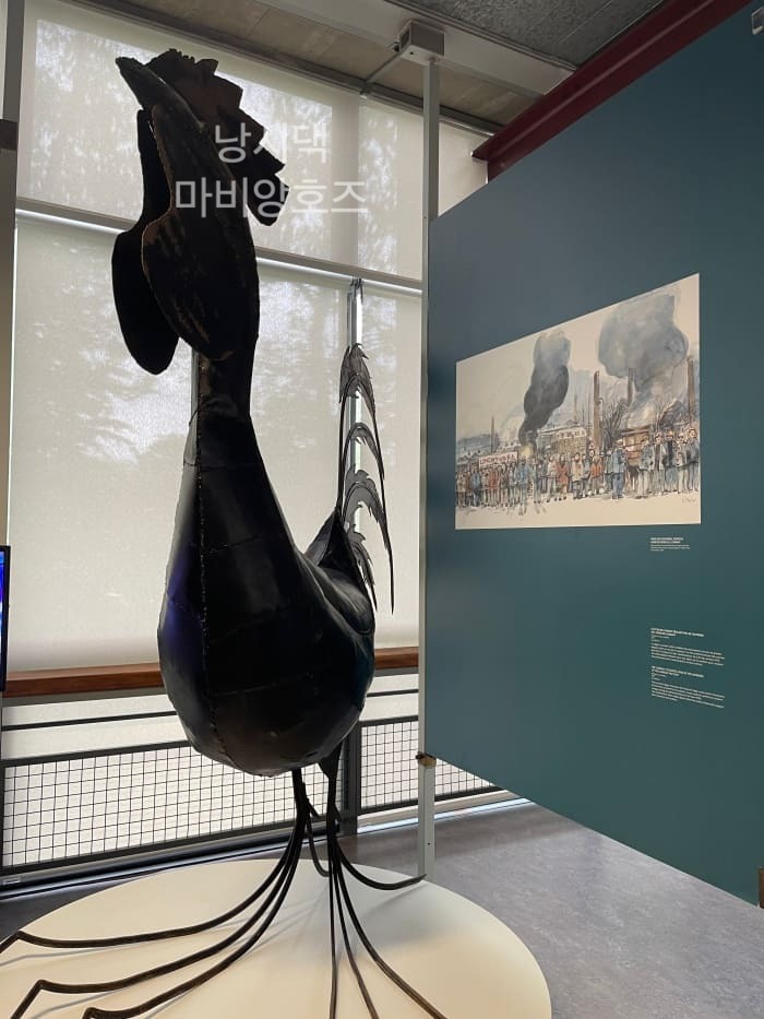 "결국 노동자들은 노조를 결정하고 기업에 맞서 투쟁했어요. 이 커다란 숫탉은 노동자들이 시위비용을 충당하기 위해서 판매용으로 제작했답니다. 왜 하필 숫탉일까요?"
