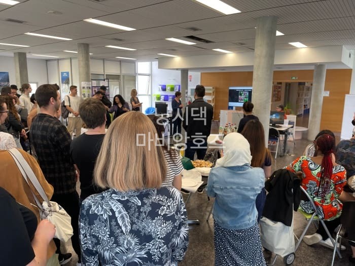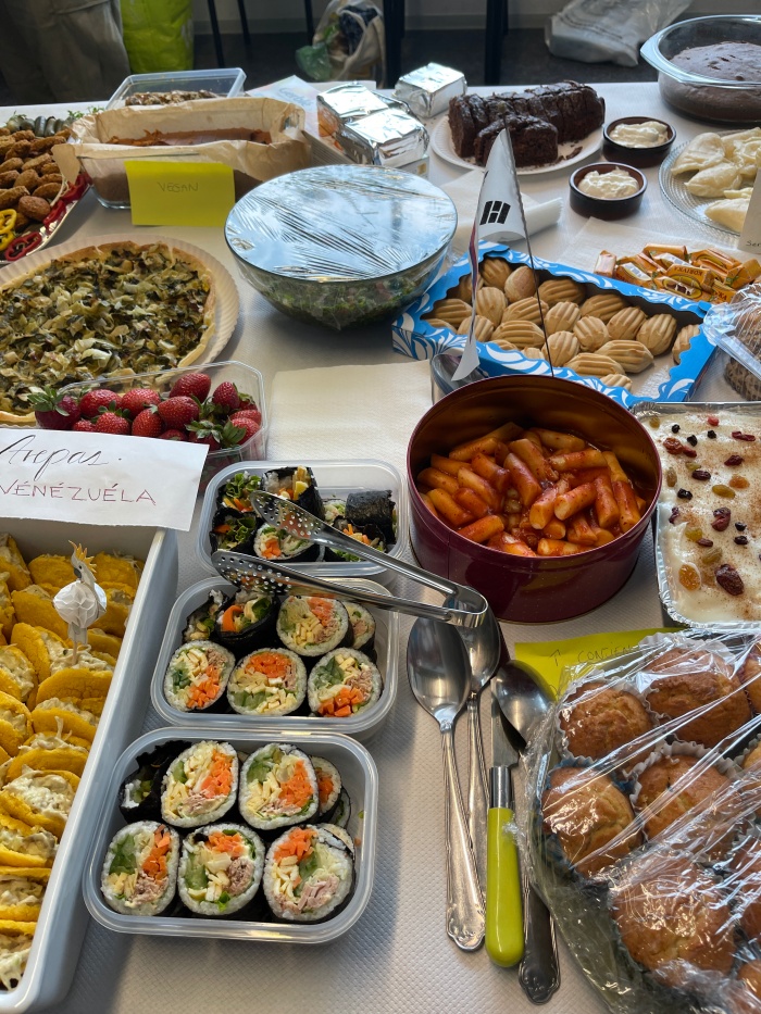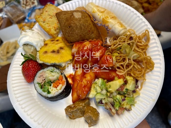 살짝 늦게 도착했는데 이미 행사가 진행되고 있었다. 뒷쪽에 있는 테이블에는 이미 다양한 음식들이 가득 차려져 있었는데 나는 내 소듕한 김밥 세통을 테이블 한가운데에 보기 좋게 올려놓았다.