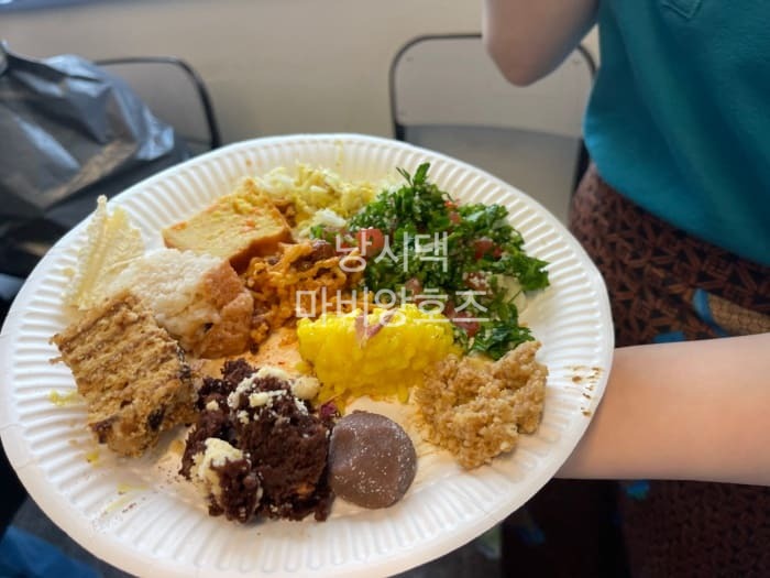 낯익은 키슈랑 비닐에 쌓여있는 타불레는 카자흐스탄 친구와 시리아 친구가 싸온 것들일것이다.