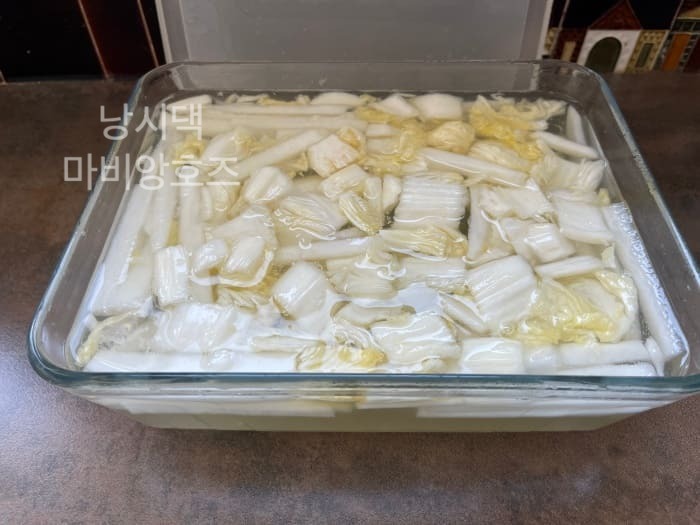 상온에 이틀간 보관했다가 맛이 들었길래 냉장고로 옮겼다. 뒤늦게 야채칸에 남은 배추가 있길래 잘라서 절인 후 동치미에 추가로 넣고 사이다도 더 추가해 줬다.