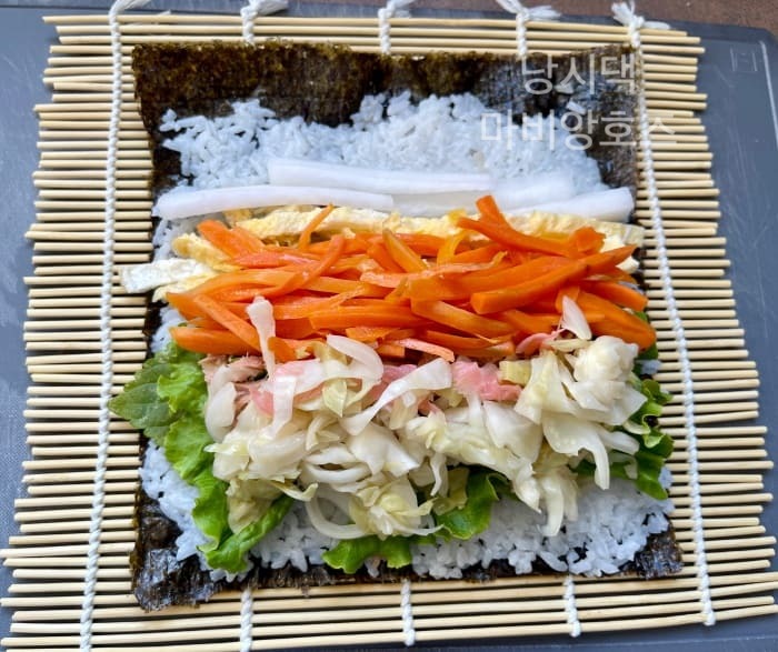 무는 일부러 김밥쌀때 편하라고 길쭉하게 썰었는데 역시 김밥에 잘 어울린다.