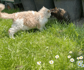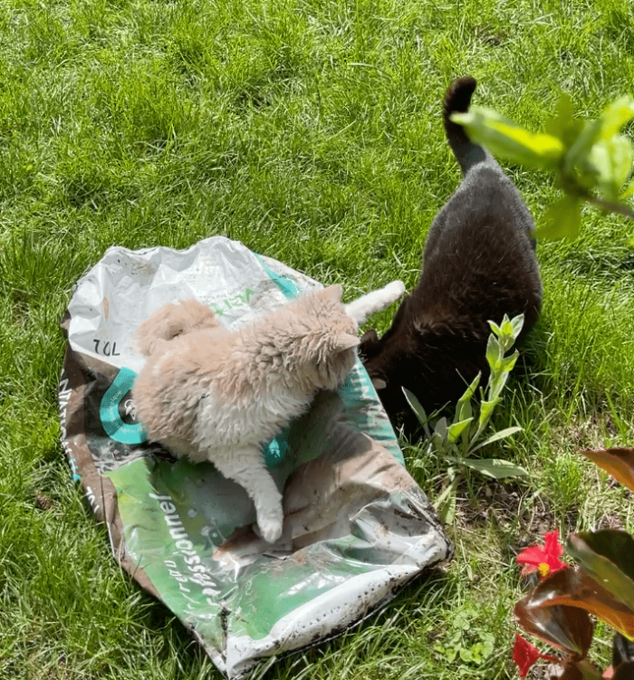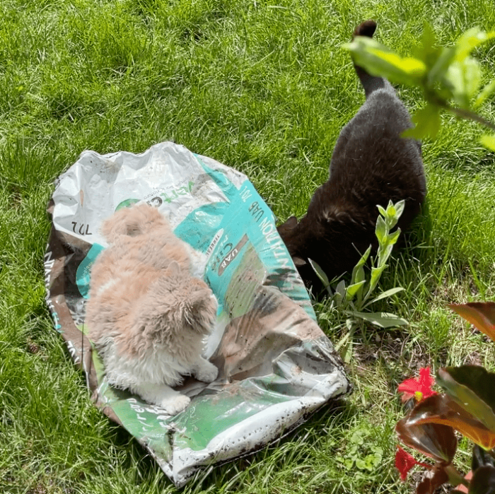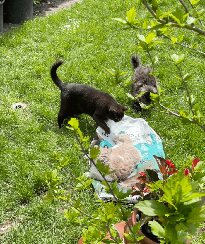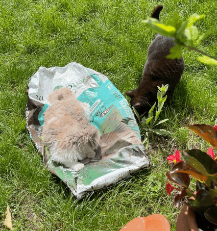 그런데 탈린이 깔고 누워있는 퇴비 포대가 탐이 났던지 이스탄불이 포대아래에 머리를 집어넣기 시작했다.