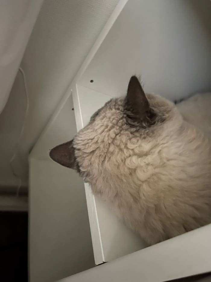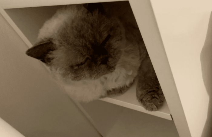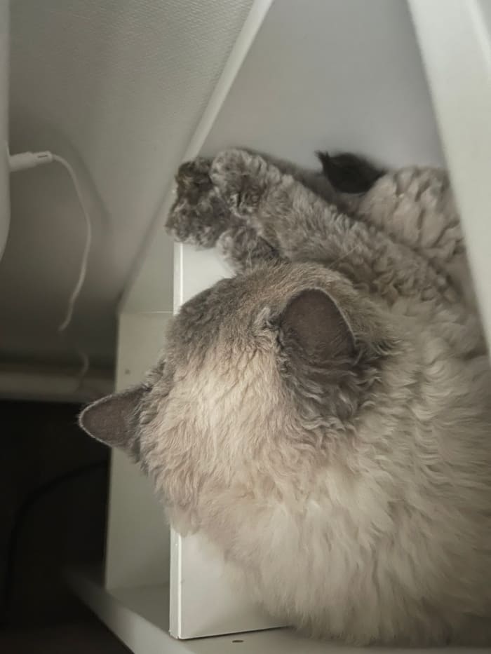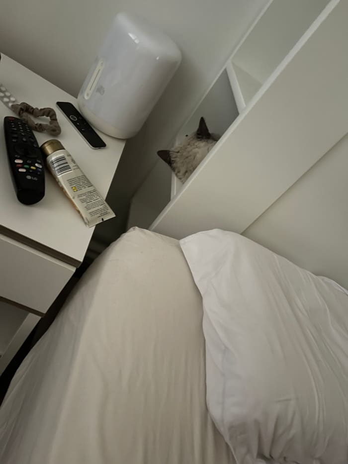 여름에는 이곳 침대 머리맡 선반을 좋아하는데, 아마 이 곳이 시원해서 그런듯 하다. (반면 기온이 조금이라도 떨어지면 내 배위로 올라온다.)