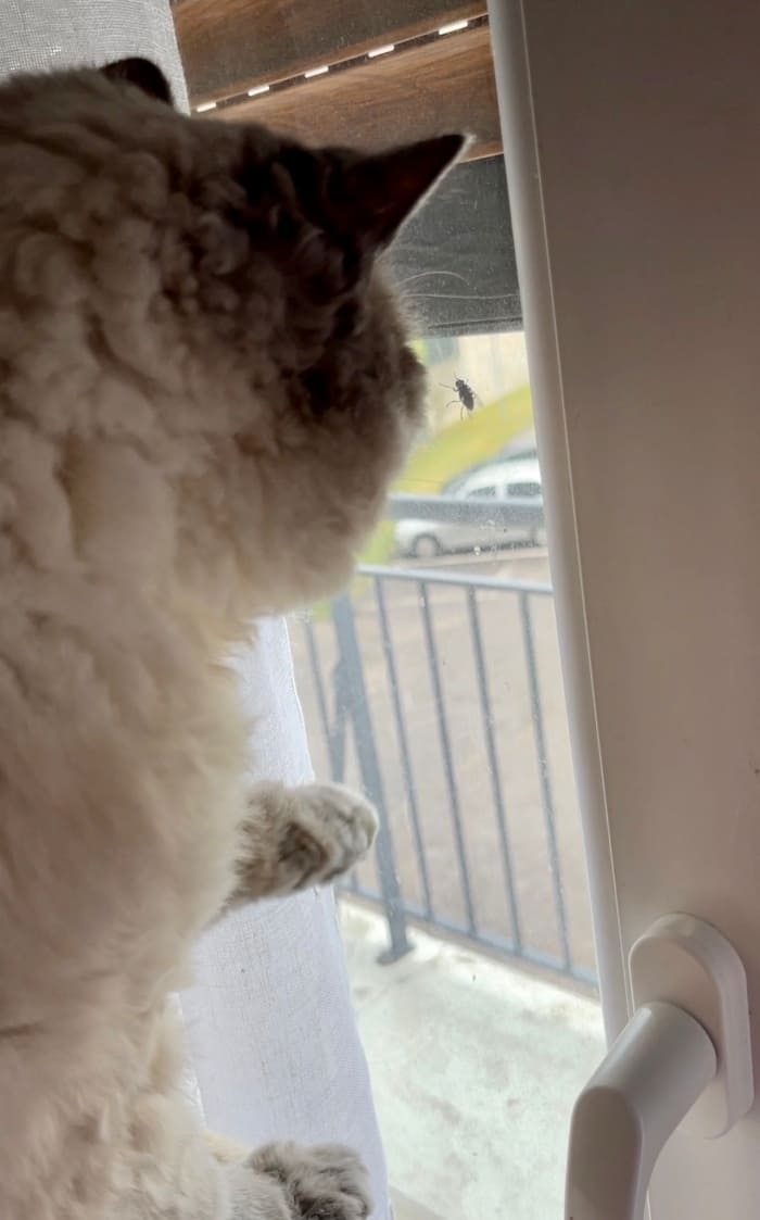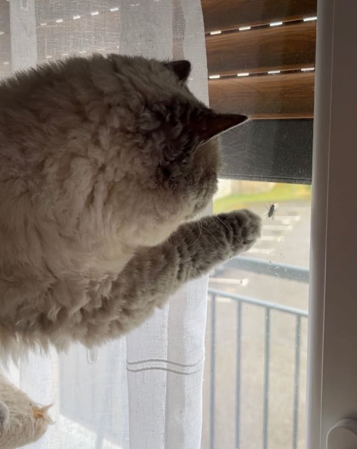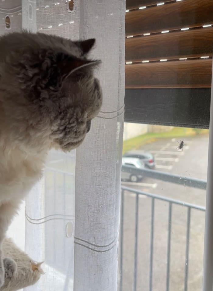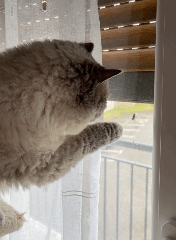 창문에 자세히 보면 무스카델의 콧김과 털이 보인다. 이미 한참 전부터 파리를 잡으려고 창문에 매달려 있었다는 증거이다.
