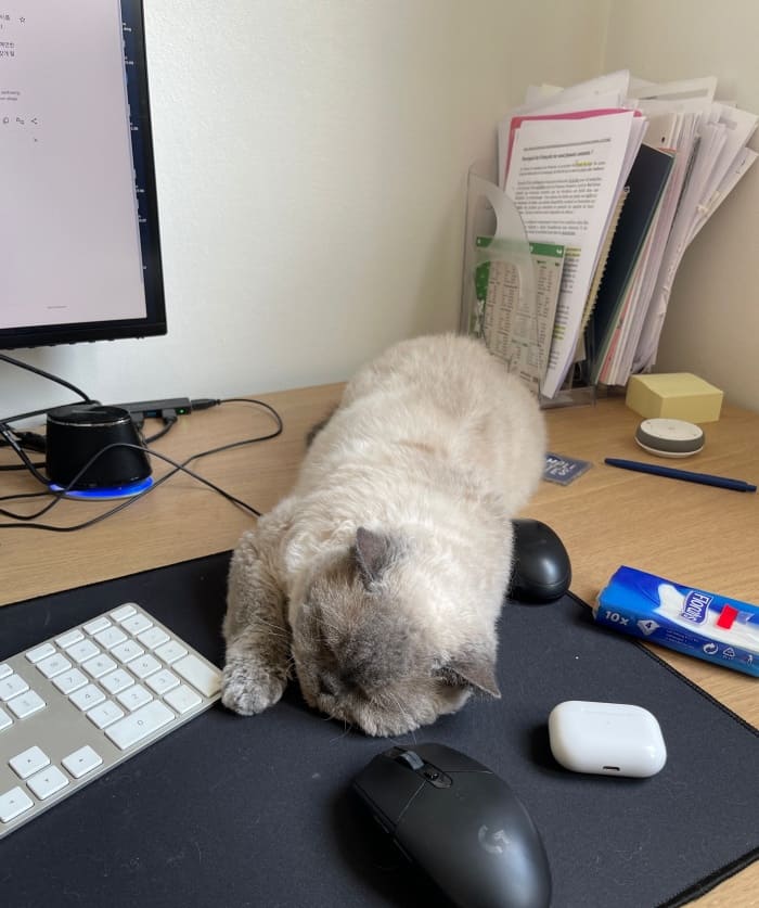 무식아, 다른데 편한곳 많은데 꼭 여기서 자야겠니? 키보드랑 마우스 만지는 소리가 꽤 거슬릴텐데...