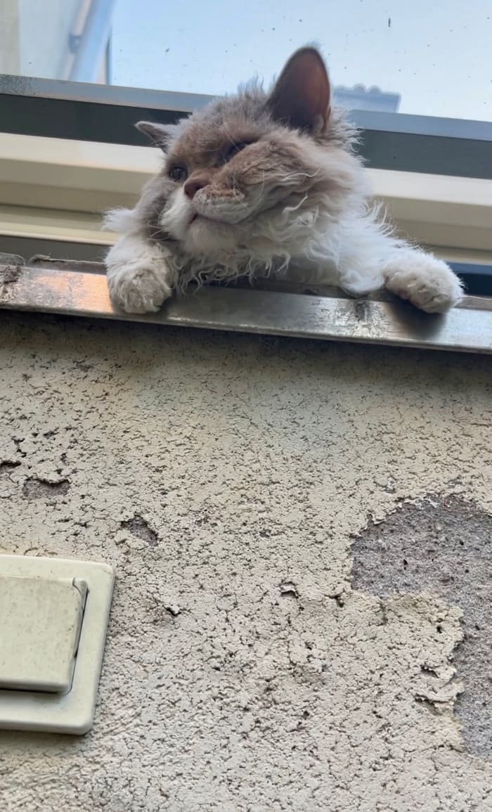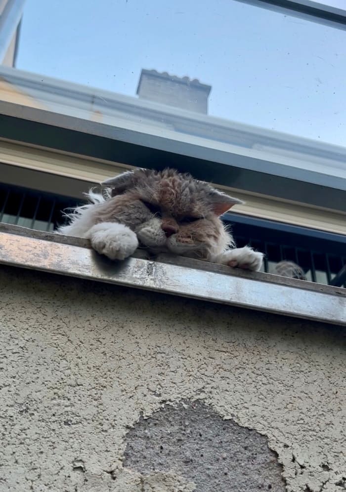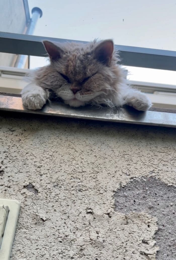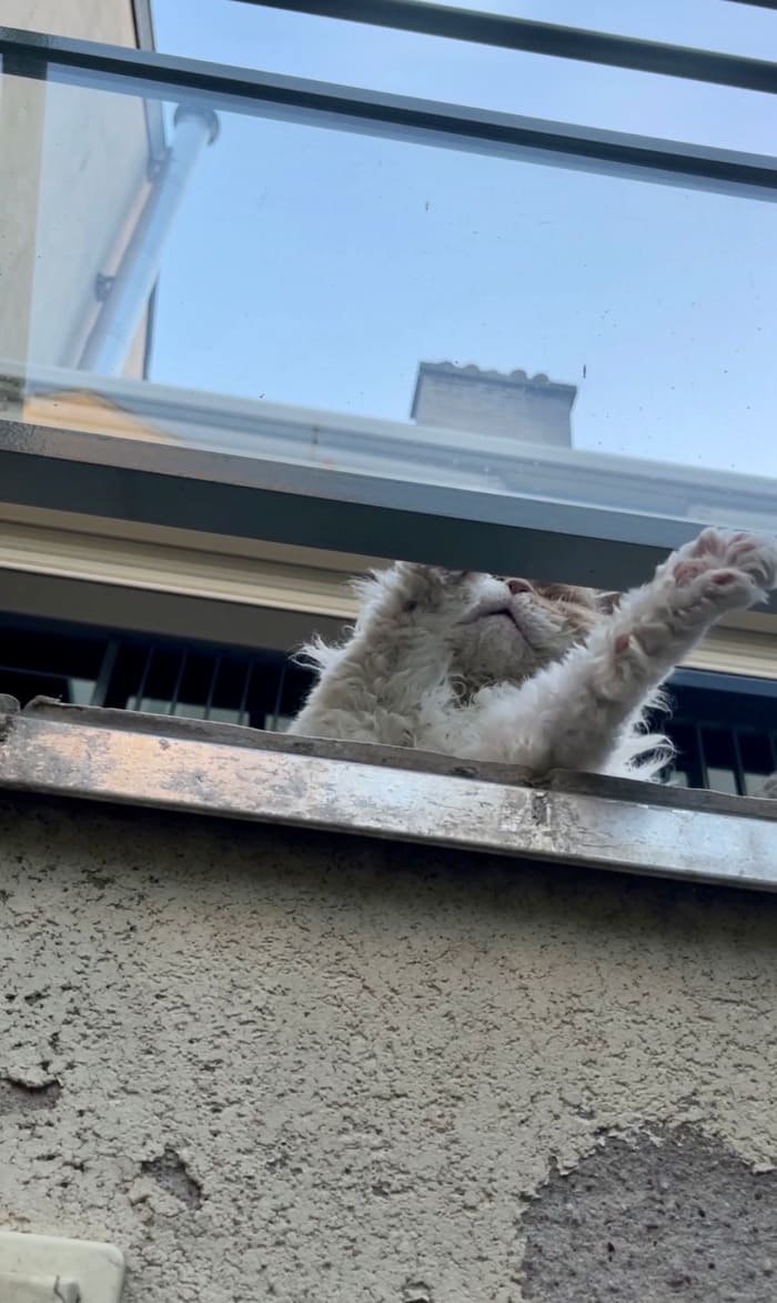 그때 막내 고양이 탈린이 테라스위에서 나를 구경하고 있는 모습을 발견했다.