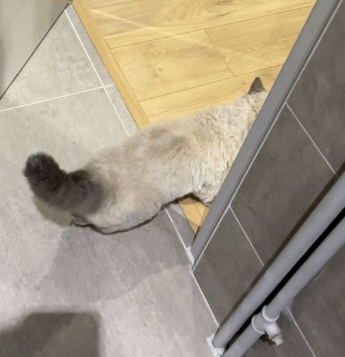 매우 불안한 표정이지만 두번째 시도에서는 용감하게 욕실 밖으로 나가는데 성공했다.