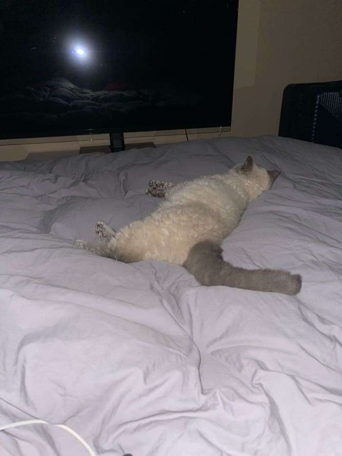 그런데 밤에 일찍 자려고 혼자 침실로 가서 불을 껐는데, 무스카델이 침대위로 뛰어올라오는 소리가 들렸다. 휴대폰 조명을 켜서 보니 세상 편한 자세로 누워있네?