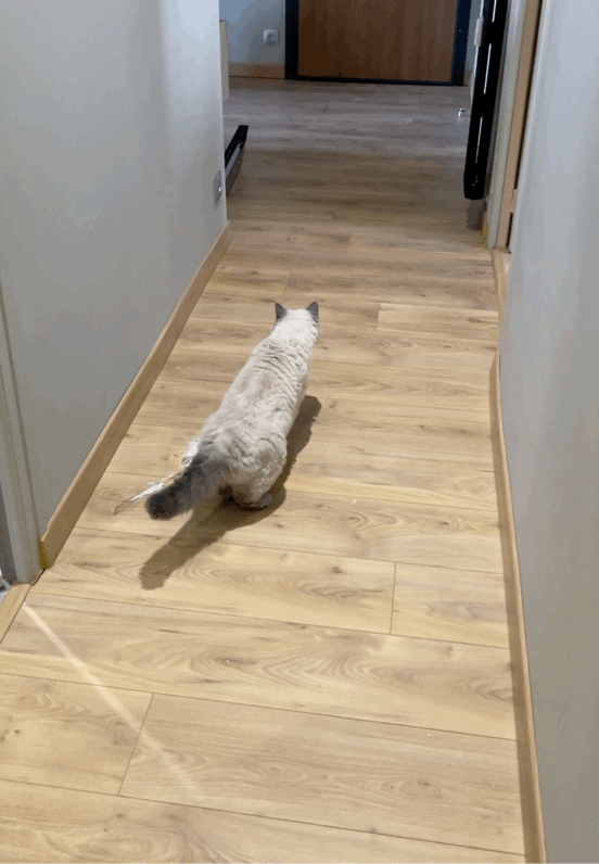 하지만 발걸음이 매우 어색하다. 마치 뒷발은 앞발만큼 용감하지 않은지 자꾸만 질질 끌고있는 듯 하다.