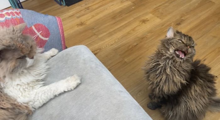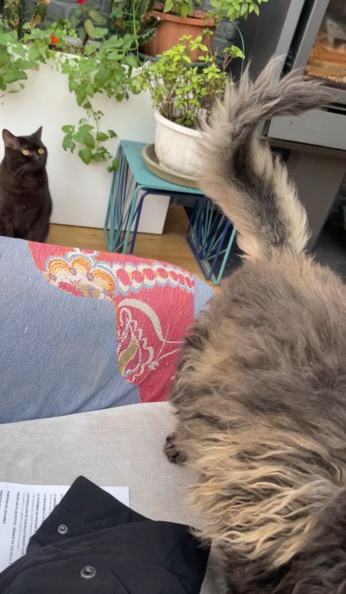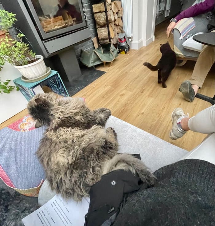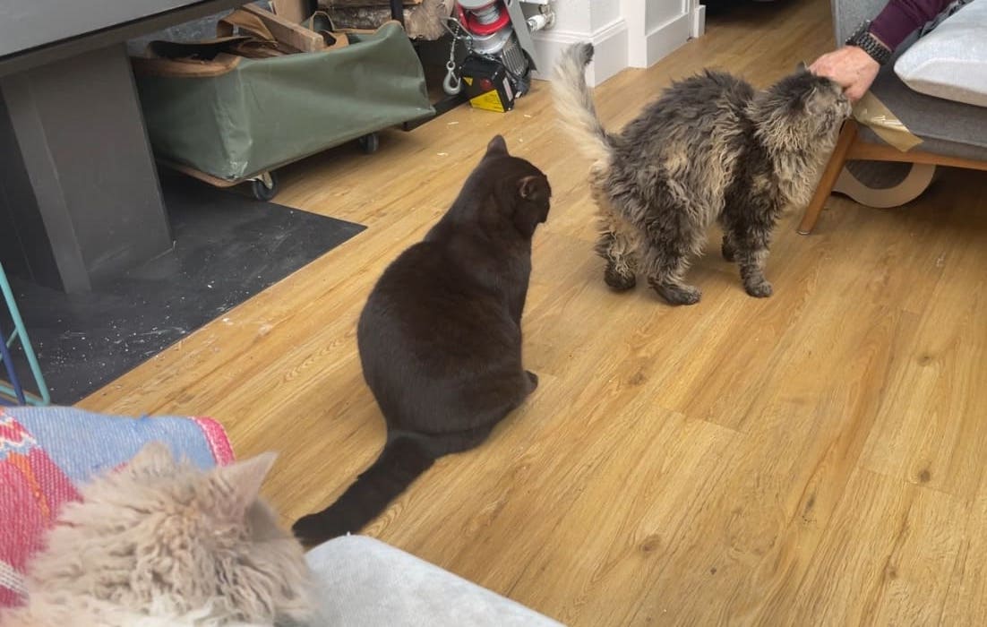 모웬이 내 옆자리로 올라오고 싶은데 탈린때문에 불만이 가득한 표정이다. 탈린은 오빠가 왜 저런 눈으로 빤히 쳐다보는지 알지도 못하고 관심도 없음.