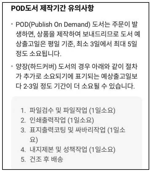 POD주문방식은 주문과 동시에 책의 인쇄가 이뤄지므로 낭비되는 책이 없는 장점이 있다고 하네요. 하지만 주문후 평일기준 3-5일 정도 소요가 된다고 해요. 실제로 저희 언니는 주말 포함해서 열흘만에 받았답니다 ㅡㅡ;; 한권만 일단 주문해서 이상없는지 확인한 후 다른 물건들과 함께 부쳐달라고 부탁을 했던 것인데 크리스마스 전까지 프랑스에 도착할 것인지 궁금하네요; 어머님께 크리스마스 선물로 드릴 계획이거든요.