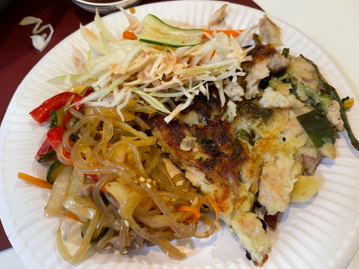 부엌이 너무 작아서 요리가 수월찮은데다 이제는 오븐도 없으니 최대한 머리를 굴려서 메뉴를 골랐다. 닭다리 살로 만든 닭파전이었다. 양배추를 채칼로 슬라이스해서 한국식 샐러드도 만들었다.