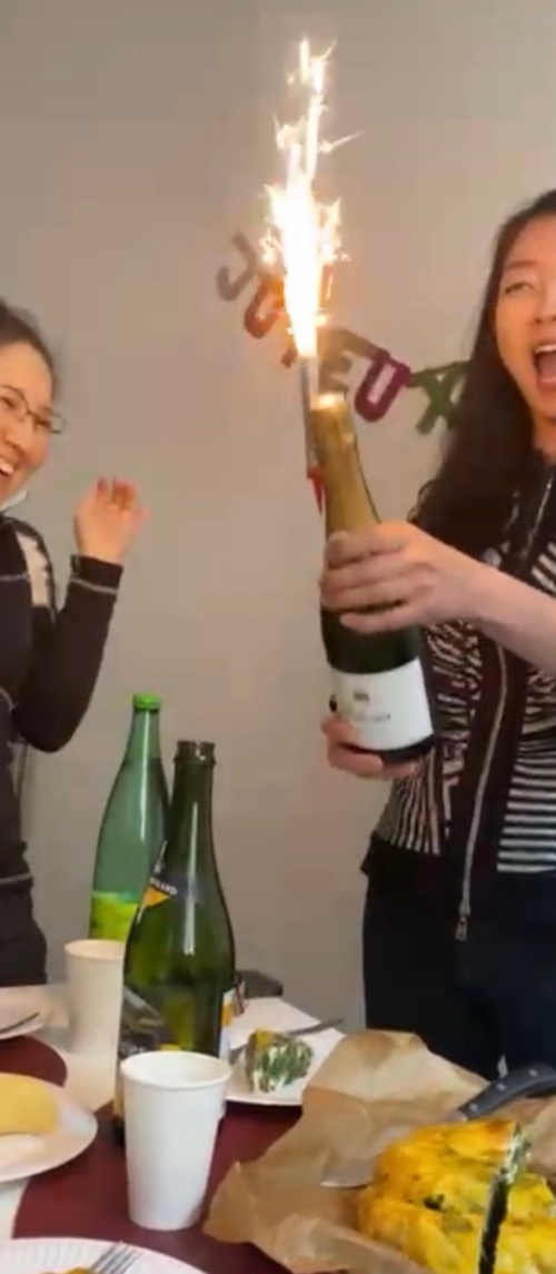 에리카는 웬일로 제일 일찍 도착했었는데 친구들이 도착하기 전에 미리 준비해 온 데코를 벽에다 장식해 주었고 가져온 샴페인에 폭죽을 달았다.