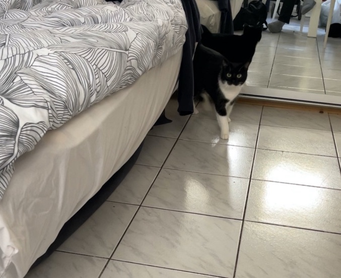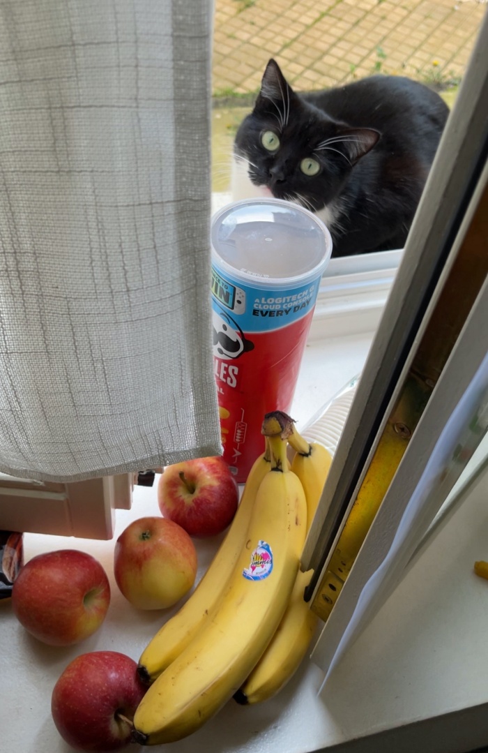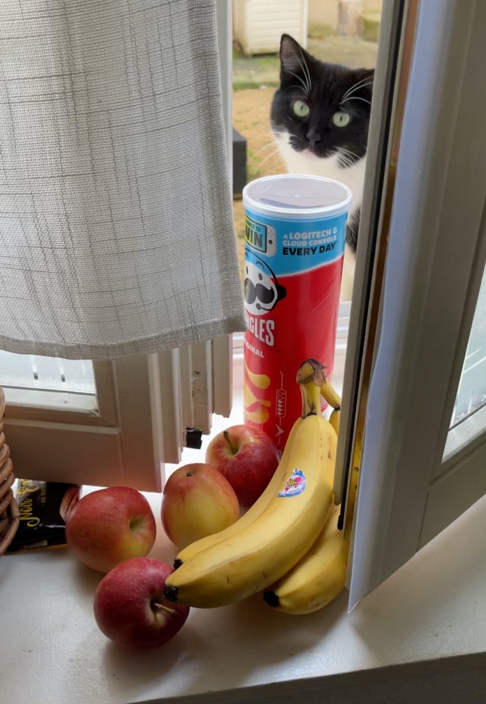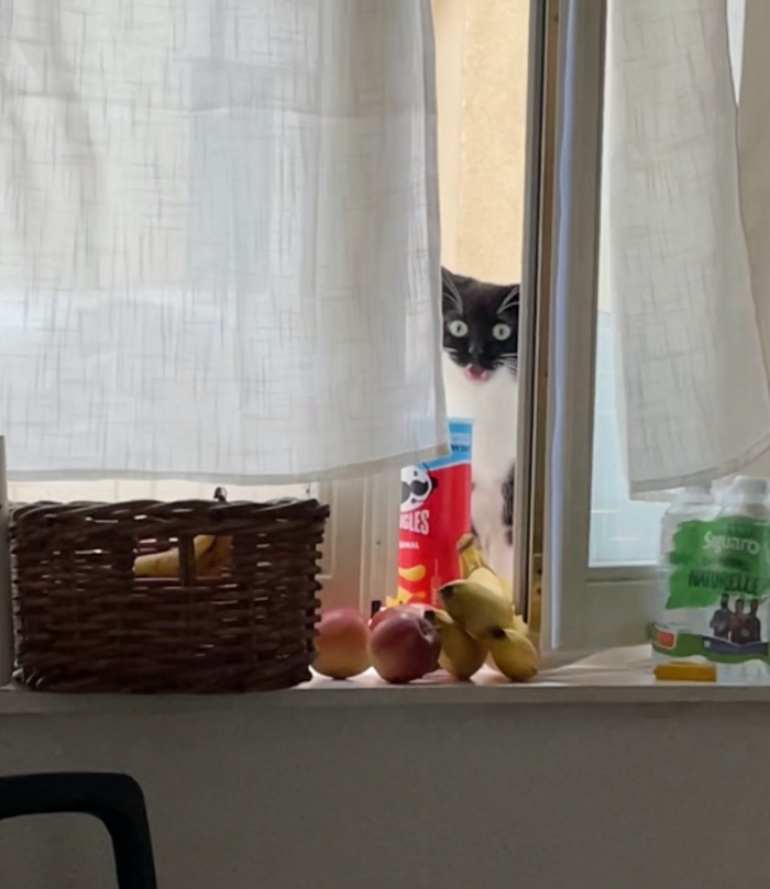 설거지를 끝내고 돌아섰더니 고양이는 창밖에 있었던 것이 아니라 이미 열린 창문을 통해 내 집안에 들어와 있었던 것이었다. 돌아서서 설거지를 하는 내 등에다 대고 나름 혼자서 수다를 떨고 있었던 모양이다.