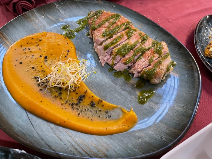 스시케이크라고 했던가...? 말만 들었을때는 또 무슨 생선을 갈아서 분자요리를 만드는건가 싶어서 반감이 좀 있었는데 막상 먹어보고는 너무 맛있어서 우리 둘다 눈이 휘둥그레졌다. 밥과 스시 그리고 새우튀김등등을 넣어 사각틀에 찍어내고 그 위에 새콤 달콤한 소스를 얹었다. 아보카도랑 미역줄기무침도 조화가 좋았다. 우리가 대만족해 하는 모습을 본 셰프가 매우 흡족해했다. 무슨 요리 대회에서 수상을 했던 메뉴라고 소개했던 것 같다.