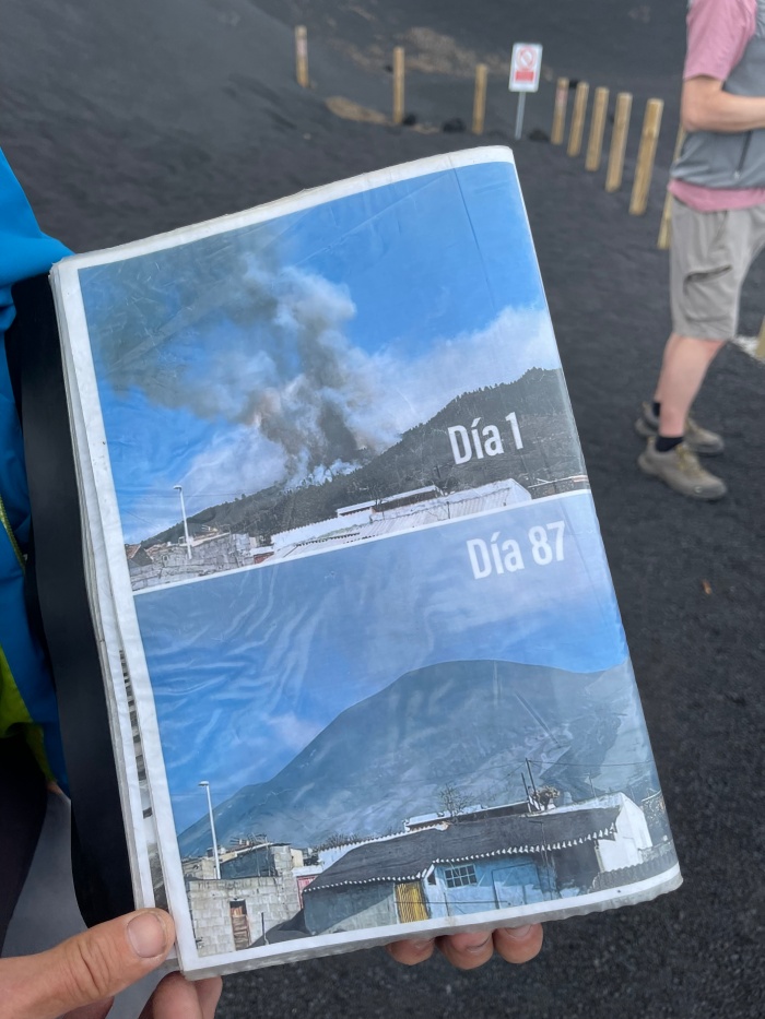 "여기 화산 1일차와 87일차의 사진을 비교해 보세요. 이곳은 원래 산이 아니었어요. 지금 우리가 밟고 있는 이 산은 용암과 화산재가 쌓여서 그 옆의 봉우리보다 더 높이 솟아오른거예요."