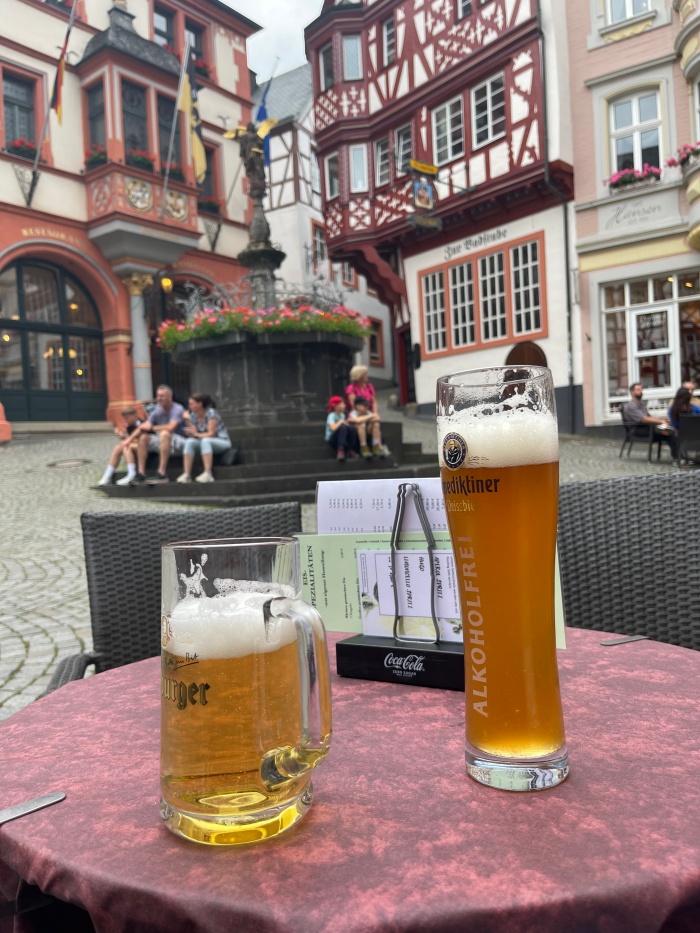 예쁜 마을을 한바퀴 돌고나서 우리는 사람들이 가장 많이 붐비는 테라스에 앉았다. 독일에 왔으니 맥주는 마셔봐야지.