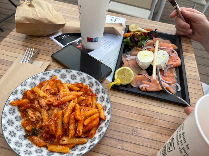 매콤한 아라비아따 파스타랑, 큼직한 모짜렐라가 얹어진 훈제 연어를 빵과 함께 먹었다. 강변에서 먹으니 더 맛있구나!