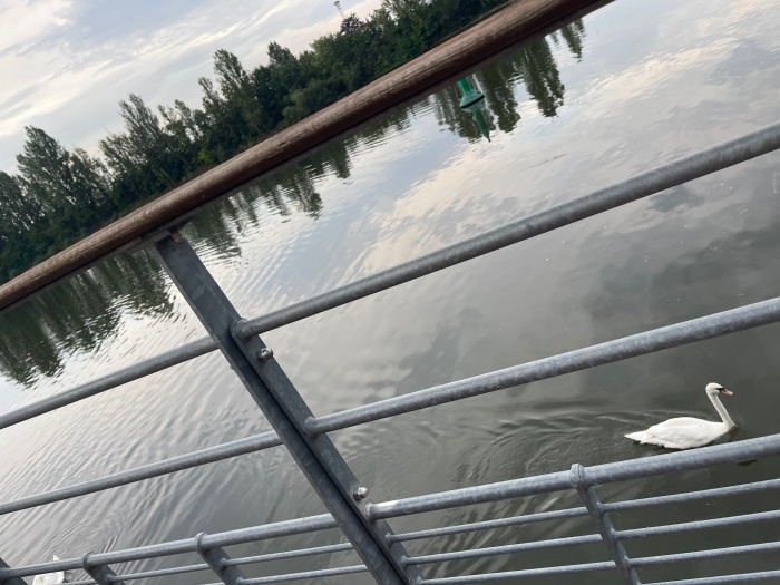 컨트리 음악이 더이상 들리지 않는 곳까지 더 걸어갔더니 이번에는 라이브 여가수가 멋드러지게 팝송을 부르는 모습이 보였다. 마침 운좋게 빈 테이블을 찾아 앉을 수가 있었고 버거씨는 곧 바에 가서 맥주를 두 잔 사왔다. 줄이 꽤 길어서 시간이 걸렸지만 그동안 나는 기분좋은 강바람을 맞으며 백조들과 인사를 나누었다.