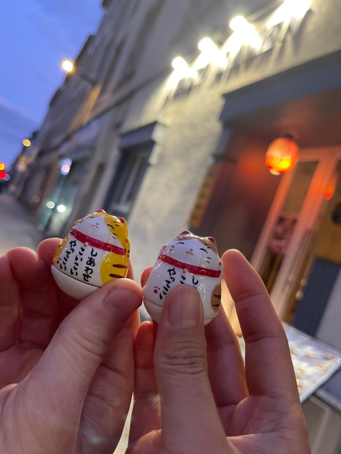 장사 1주년 기념이라며 작은 고양이 오뚜기를 하나씩 준 것이다. 우리는 둘다 좋아서 비명을 질렀다. 섬세한 버거씨ㅋ