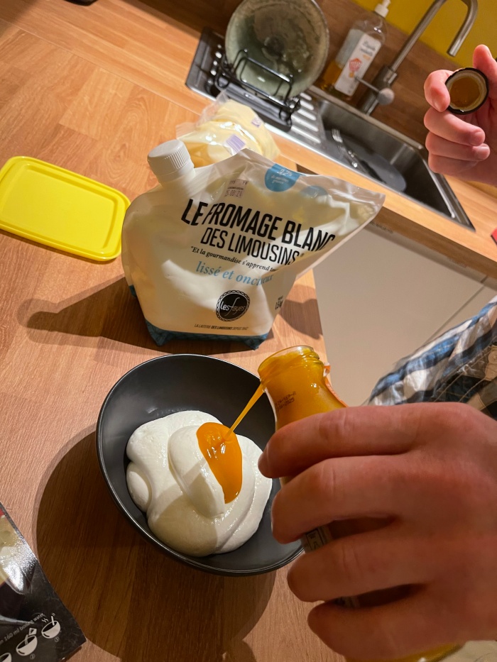 화이트치즈를 붓고 그 위에다 망고퓨레를 뿌려서 맛있게 먹는 버거씨. 따라서 먹어봤는데 내 입에는 요거트랑 차이를 모르겠다. 유산균 vs 단백질 함량의 차이인가...?