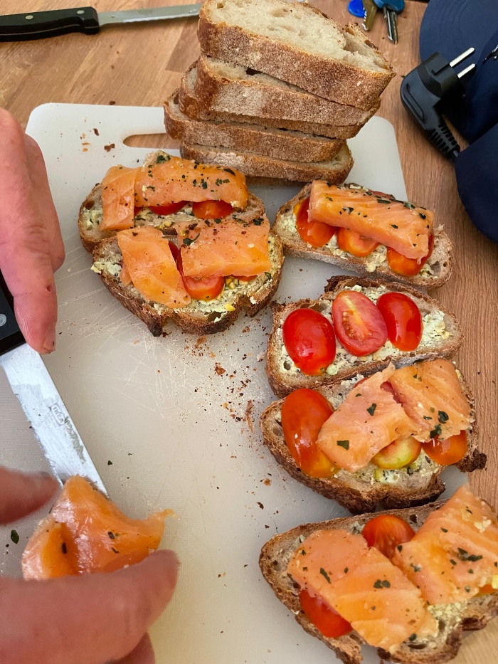버거씨는 남은 훈제연어를 가지고 간식 샌드위치를 만들었다.