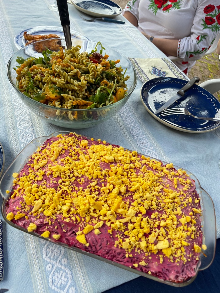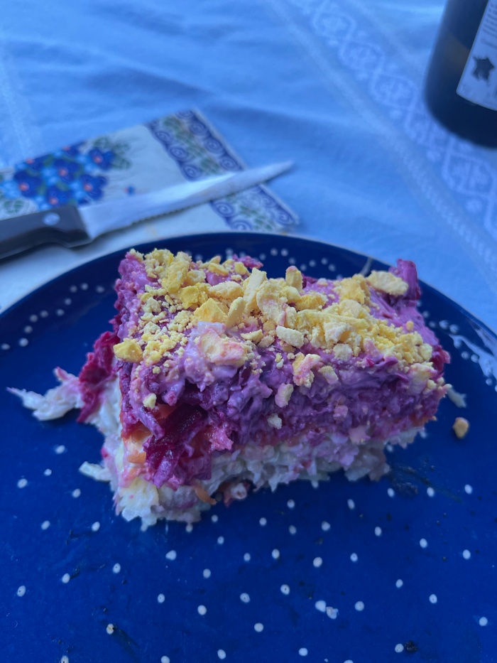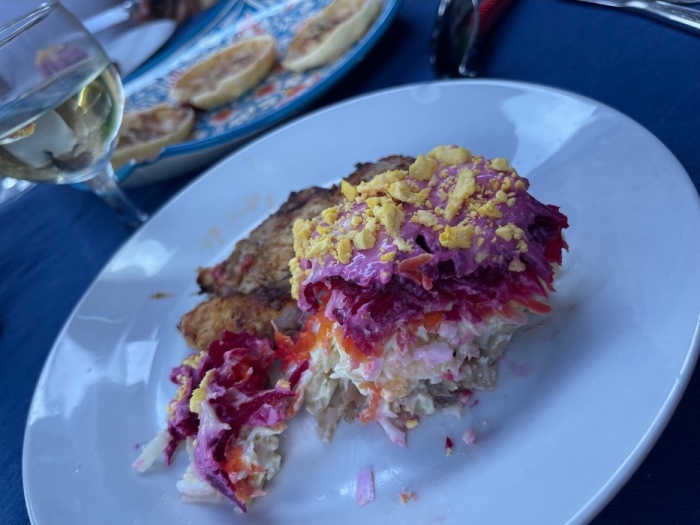 감자샐러드, 흰살 생선, 계란흰자, 양배추, 계란 노른자 등을 층층이 쌓아 올린 음식인데 러시아와 그 주변 국가들에서 먹는 전통 음식이라고 했다. 생각해보니까 태국살던 시절 러시아 레스토랑에서 비슷한 것을 먹어본 기억이 난다. 물론 알마의 요리가 훨씬 더 맛있고 정성이 들어간 것 같다.