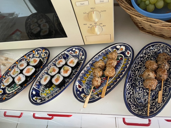 메인 요리가 나오기 전에 가나코가 준비해 온 스시랑 미트볼이 먼저 테이블 위로 올라왔다. 이걸 본 버거씨가 어이없게도 큰소리로 나에게 이렇게 말했다.