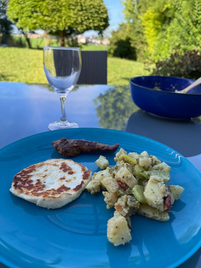 사과, 오이를 넣은 샐러드와 시드르를 곁들여서 테라스에 앉아 맛나게 먹었다. 버거씨의 정성이 듬뿍 들어간 음식이었다.