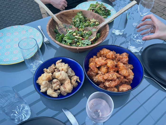 내가 닭을 빠른 속도로 튀기는걸 본 버거씨는 서둘러 샐러드를 만들었다. 그리고 윗층에서 게임을 하던 넘버투랑 넘버쓰리가 내려와서 테라스에 테이블을 세팅했다.